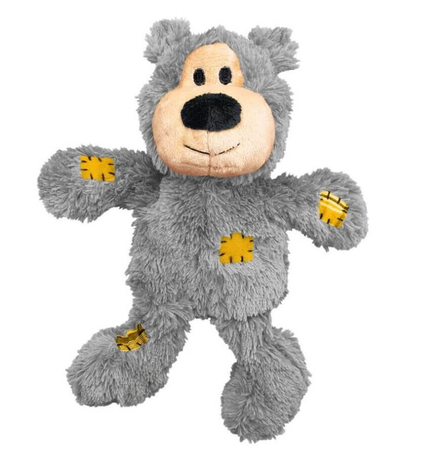 KONG Wild Knots Björn är en populär valpleksak för hundar som älskar att dra, ruska och bära runt. Den känns mjuk och gosig på utsidan, men har ett knutet repskelett på insidan som gör den mer hållbar än många vanliga plyschleksaker. Dessutom har den pip, vilket brukar trigga igång leken snabbt.